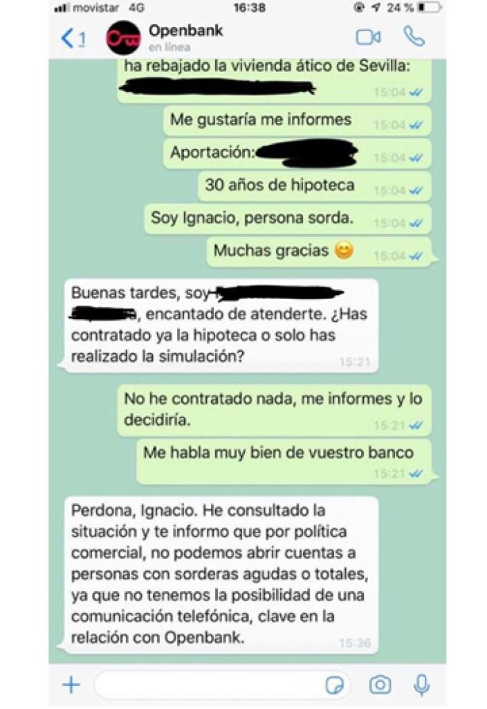 Una vez más la falta de concienciación, sensibilidad y de conocimiento sobre las diferentes opciones que hay al alcance para facilitar la accesibilidad es la razón por la que se siguen sucediendo situaciones como esta. Si el servicio de atención al cliente del banco hubiese sabido que podría haber contactado con Ignacio como lo estaba haciendo (por whatsapp), e-mail o haberle dado otras opciones como la posibilidad de comunicarse por medio de videoconferencia con un intérprete, esta situación no se hubiera producido.