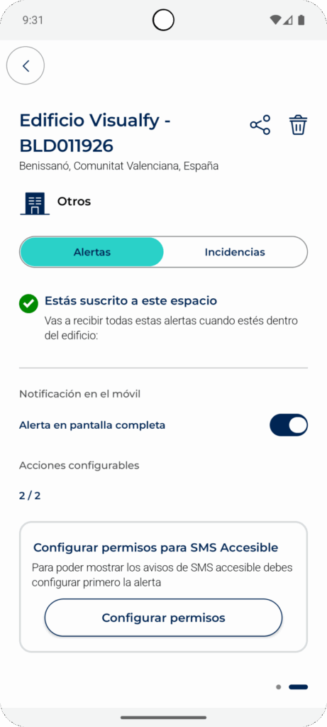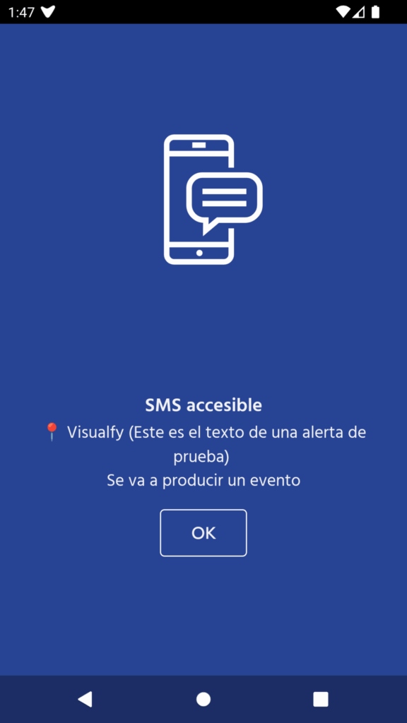 La alerta SMS accesibles es un servicio que ofrece la aplicación Visualfy Places para ayudar a las personas sordas y con pérdida auditiva a recibir alertas de los mensajes de texto (SMS) enviados por el edificio al que se está suscrito.